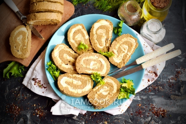 Печеночный рулет — сытная и питательная закуска, кроме того, она очень полезная за счет главного ингредиента, а именно говяжьей печени. Помимо печени, масса для приготовления рулета содержит пассерованные овощи, они делают рулет более сочным и нежным. Начинкой для рулета будет сливочное масло.