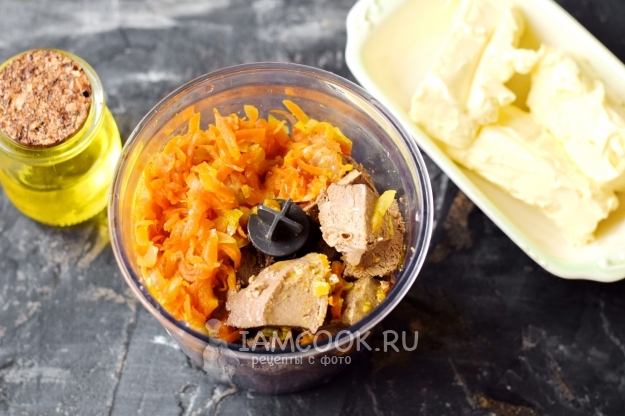 Печень и овощную смесь в теплом виде поместите в контейнер блендера. Закладку лучше делать небольшими порциями, чтобы компоненты лучше перебились. Включив кухонную машину в полную силу, превратите содержимое чаши в гладкую однородную массу. Блендер можно заменить мясорубкой.