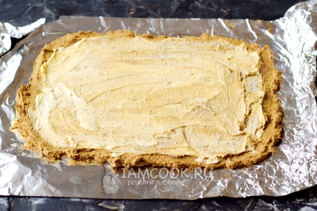 Сверху печеночный лист смажьте остальной порцией масла, разровняйте его силиконовой лопаткой.