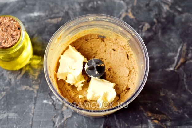 Далее добавьте 50 г сливочного масла, сдобрите состав солью и перцем по вкусу. Взбейте смесь блендером еще раз, равномерно распределяя масло по печеночной массе.