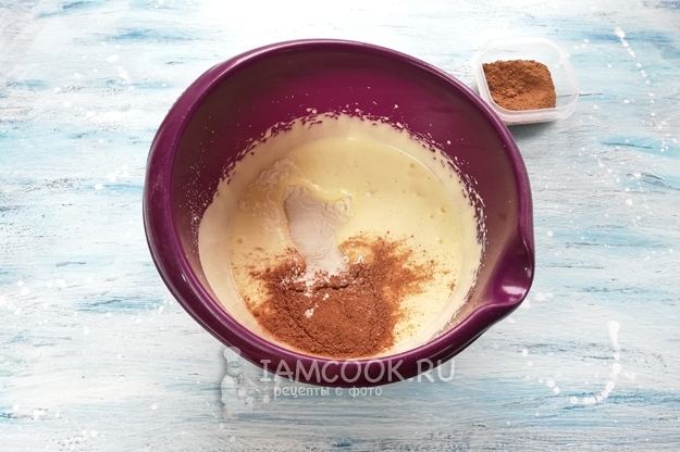 Всыпаем муку и какао. Разрыхлитель в этом печенье я не использую, так как если хорошо взбить яйца, то всё и так будет хорошо. А если вы не уверены или вам очень хочется добавить разрыхлитель, то смело кидайте его на этом этапе.