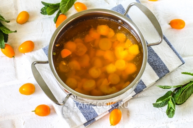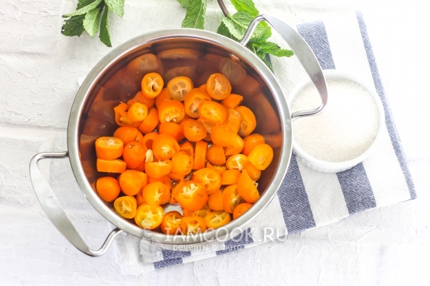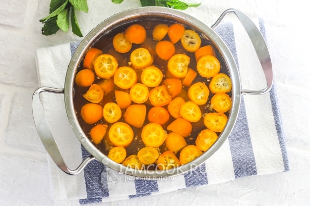 Так как кумкват едят с кожурой, то и для приготовления компота фрукт очищать не нужно. Единственный необходимый шаг - резко ошпарить плоды кипятком, чтобы кожура стала еще более ароматной. При желании вы можете добавить в компот немного лимонного сока или лимонной кислоты, но только если он покажется вам очень сладким.