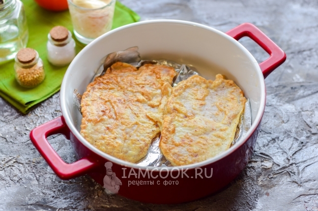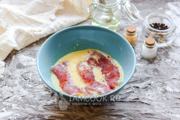 В миске взболтать одно крупное куриное яйцо, добавить пшеничную муку. Перемешать все, чтобы не было ни одного комочка. Окунуть каждый кусочек мяса в подготовленный кляр.