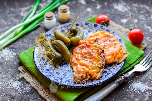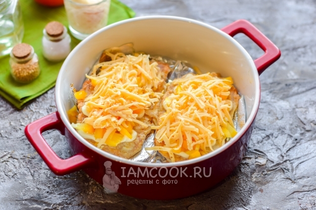 После твердый сыр натереть на крупной терке и разложить стружку поверх перца. Запекать отбивные из свинины с болгарским перцем в духовке 20 минут. Спустя указанное время мясо можно подавать к столу.