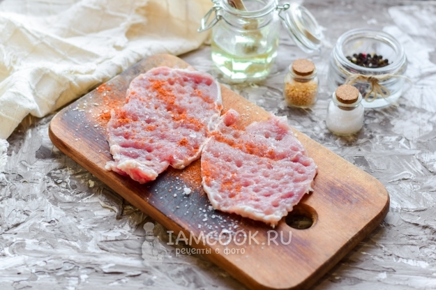 Нарезать свинину небольшими кусочками, после отбить мясо при помощи кухонного молотка. Чтобы волокна мяса не порвались, в процессе прикрыть свинину пищевой пленкой. Посыпать сразу мясо солью, перцем, специями.