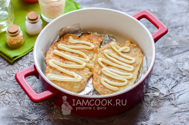 Смазать свинину небольшим количеством майонеза.