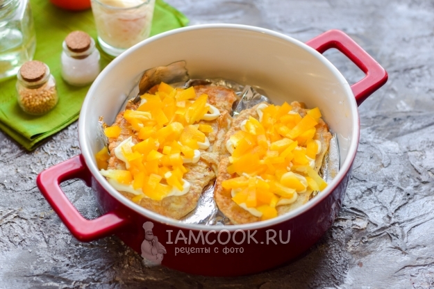 Сладкий болгарский перец почистить и нарезать маленькими кубиками. Разложить перец поверх отбивных.