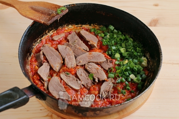 Добавляем зелень и кусочки утки в сковороду к обжаренным томатам.