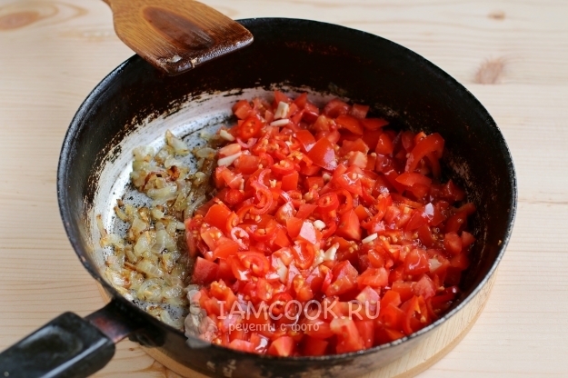 Добавляем к обжаренному луку помидоры, перец и чеснок, будем тушить овощи до мягкости.