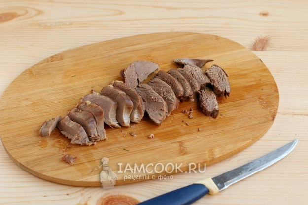 Нарежем тонкими ломтиками утиную грудку.
