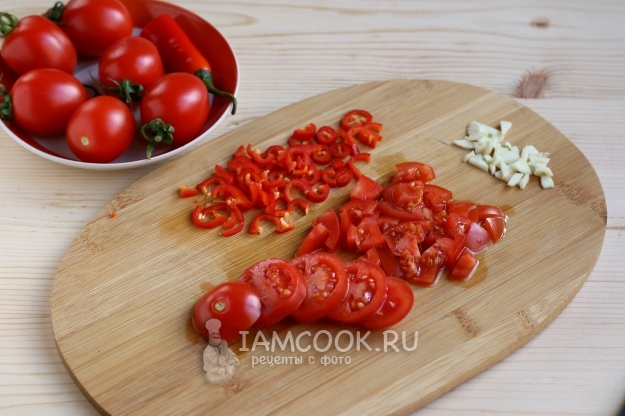 А пока обжаривается лук, нарежем кубиком помидоры, произвольно - чеснок и перец чили. У меня были помидоры небольшие, больше похожие на черри, поэтому я взяла 8 штук. Количество острого перца в блюде зависит чисто от вашего вкуса, смотря какую остроту вы любите.