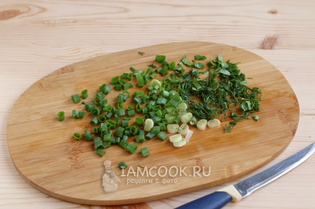 А пока основа для шакшуки тушится, нарежем перья зеленого лука и укроп с петрушкой.