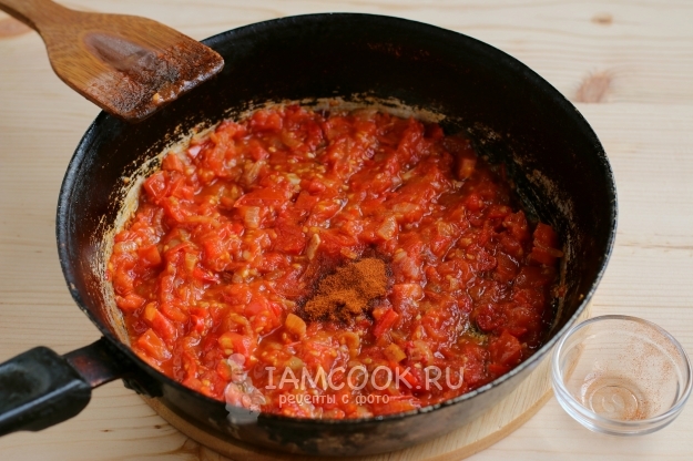 Добавляем в томатную массу молотую паприку и тушим все вместе еще минутку. На этом этапе можно посолить и поперчить по вкусу. Кстати, если у вас помидоры с кислинкой, то в процессе приготовления можно добавить немного сахарку. Я не добавляла, так как помидоры попались мясистые и очень сладкие.