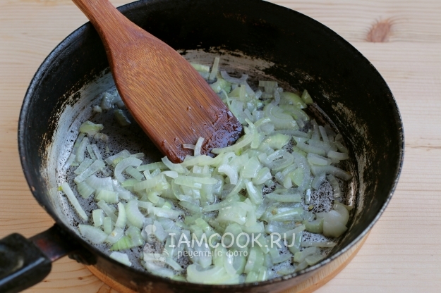 Очистим луковицу и нарежем ее четверть-кольцами или, если хотите, мельче. Разогреем в сковороде растительное масло и обжарим на нем нарезанный лук.