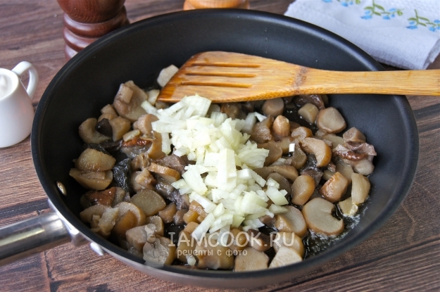 Добавьте рубленый лук и обжарьте на среднем огне до румяности.