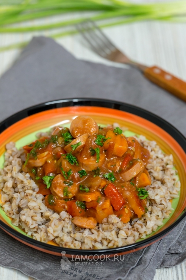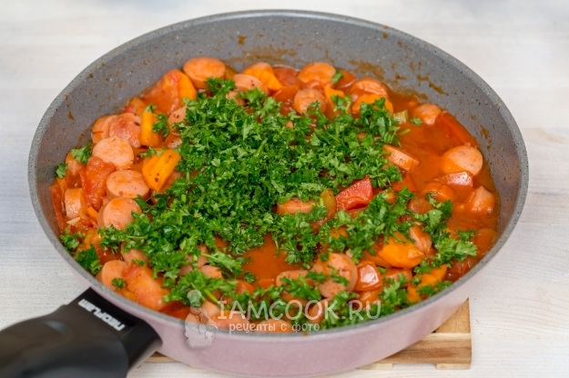 Пряная томатная подлива с сосисками и овощами готова. Подавайте тут же.