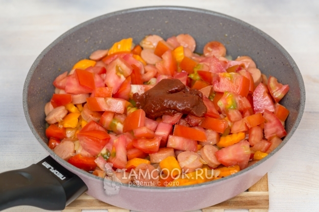 Затем добавьте нарезанные достаточно крупно помидоры, сухую аджику и томатную пасту.