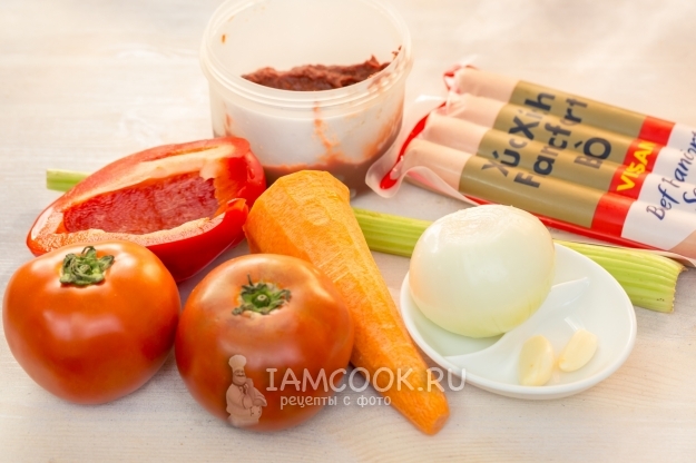 Продукты для приготовления пряной томатной подливы с сосисками и овощами подготовим по списку.