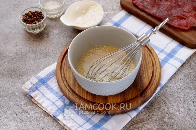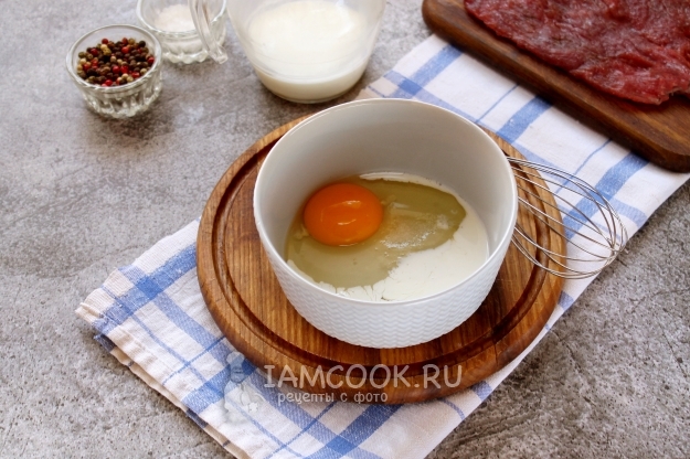 Для кляра взбиваем яйцо с молоком или водой, солим, по желанию — перчим.