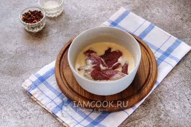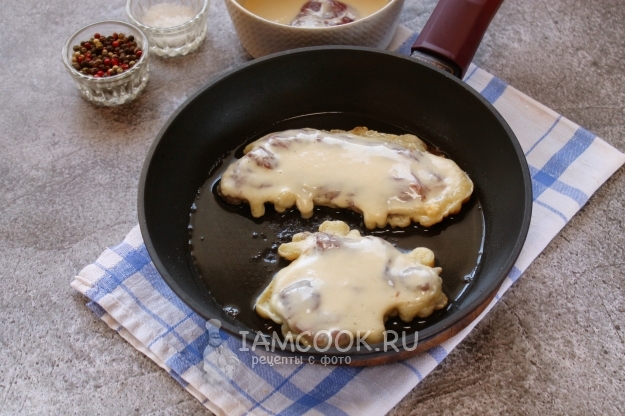Окунаем мясо в кляр, проворачиваем и покрываем мучной оболочкой со всех сторон.