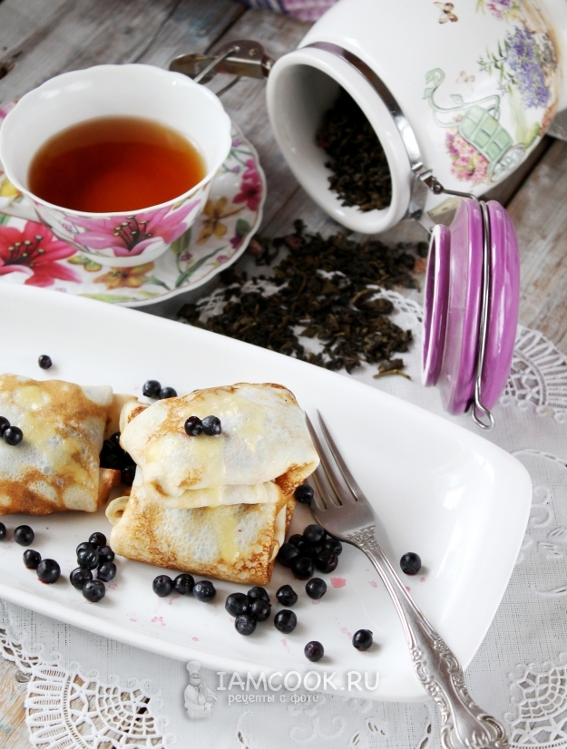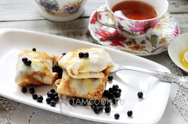 Сверните блины конвертиком. Подавать блинчики с черникой можно со сметаной, либо поливая маслом, медом или черничным сиропом.
