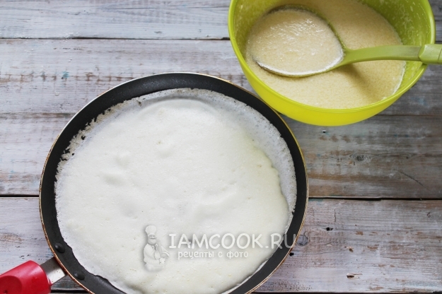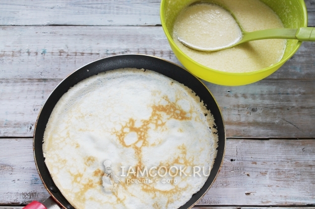 Разогрейте блинную сковороду и начинайте выпекать блины, как обычно, сначала с одной стороны.