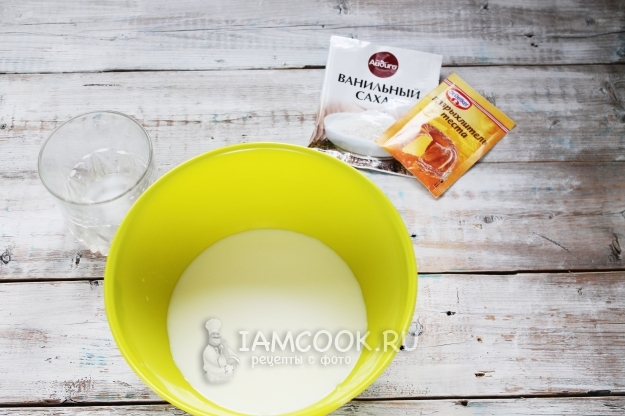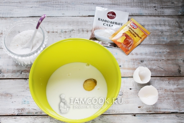 Приготовьте тесто обычным способом. Влейте в миску молоко, лучше взять теплое или комнатной температуры.