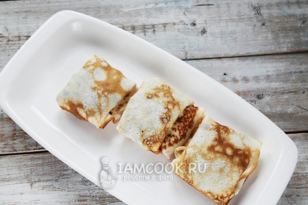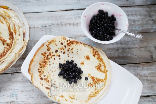 Блинчики сложите стопочкой. Когда тесто закончится, стопочку блинов переверните и начинайте фаршировать. Я в каждый блинчик клала по 2 чайных ложечки черники.