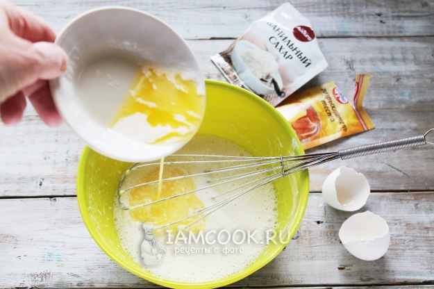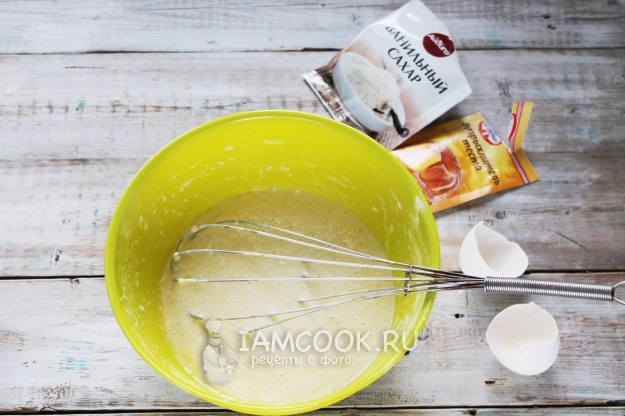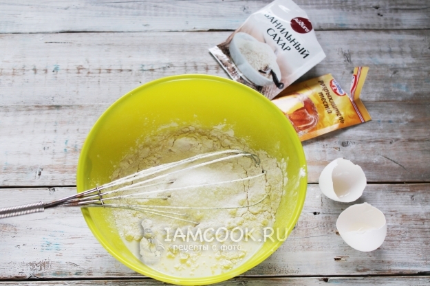 Добавьте просеянную муку, разрыхлитель, всыпьте ванильный сахар.