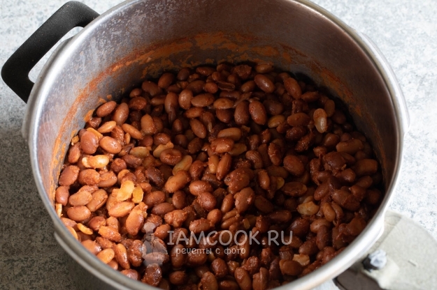 Вмешать вторую половину томатной пасты, снять крышку и варить фасоль ещё пару часов. Огонь следует подобрать так, чтобы жидкость испарялась медленно и фасоль получилась достаточно мягкой. Солят фасоль в самом конце варки.