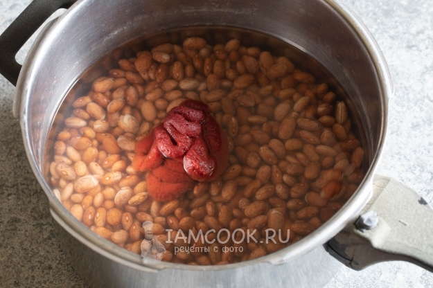 Залить фасоль свежей водой и добавить половину томатной пасты. Размешать. Варить фасоль под крышкой на среднем огне 60 минут с момента закипания.