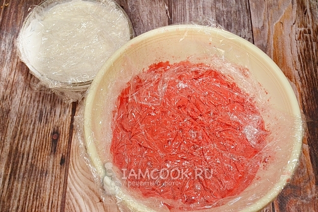 Разделим теперь массу на две части и каждую подкрасим красителем. Одну часть окрасим в белый цвет диоксидом титана, а вторую — красным жирорастворимым красителем для шоколада. Количество красителя определяем в зависимости от того, насколько яркий цвет нам нужен.