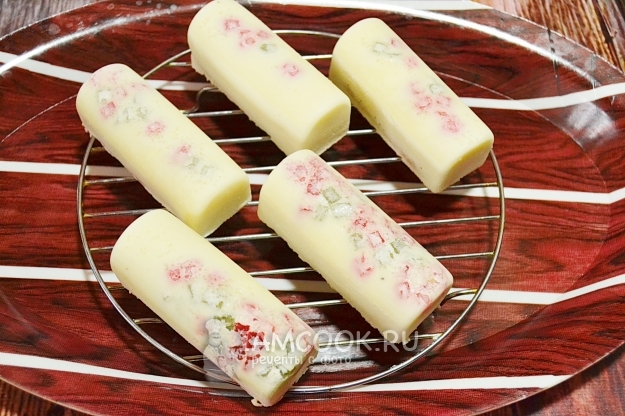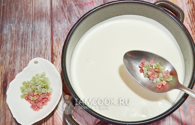 Соединяем обе массы, хорошо перемешиваем и добавляем цукаты.