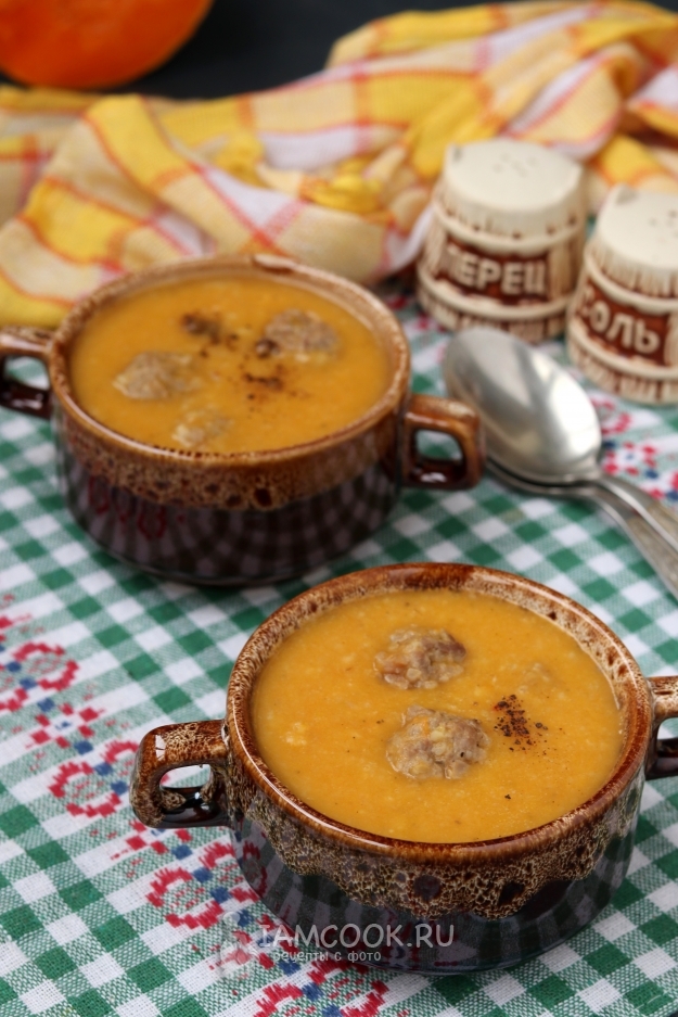 Разлить тыквенный суп-пюре с булгуром и фрикадельками в тарелки и подать к столу.
