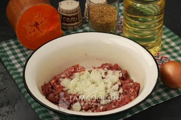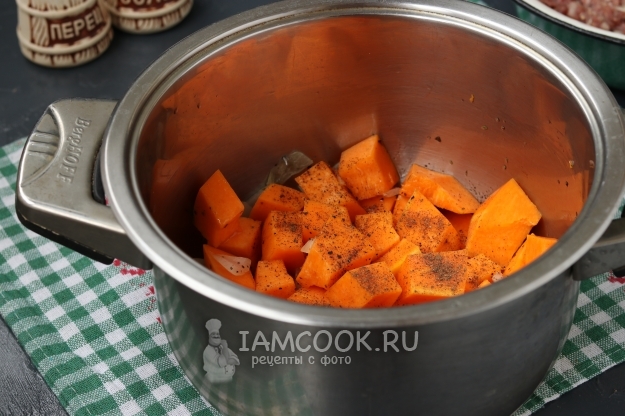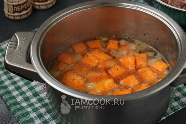 Луковицу нарезать крупным кубиком. В кастрюле разогреть пару ложек растительного масла, добавить лук, немного обжарить. Затем добавить нарезанную крупным кубиком тыкву, молотый перец и сухой базилик. Слегка обжарить, до появления лёгкого аромата.
