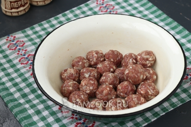Говяжий фарш поместить в миску, добавить соль, перец и одну измельчённую луковицу. Фарш хорошо перемешать и отставить в сторону, чтобы все составляющие хорошо подружились и легче было слепить фрикадельки.