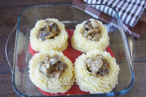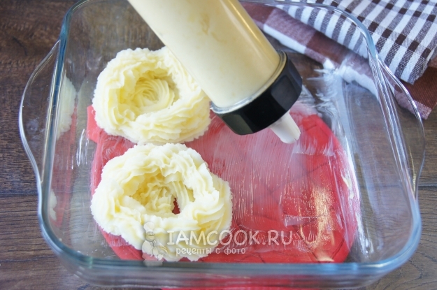 Смажем форму для запекания сливочным маслом, в кулинарный шприц или кулек выложим картофельное пюре и сделаем гнезда, так, как показано на фото.