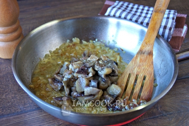Добавим предварительно размороженные грибы, посолим и обжарим минут 15 на среднем огне, при этом помешиваем.