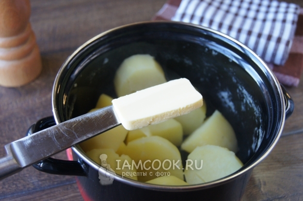 Как только картофель станет мягким, сольем воду, добавим сливочное масло.
