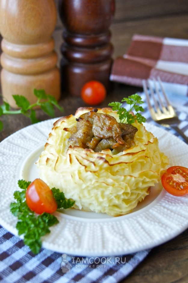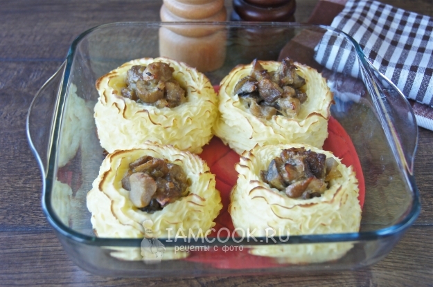 Ароматные, аппетитные картофельные гнезда с грибами готовы. Подавать их нужно в горячем виде со свежими овощами и зеленью.