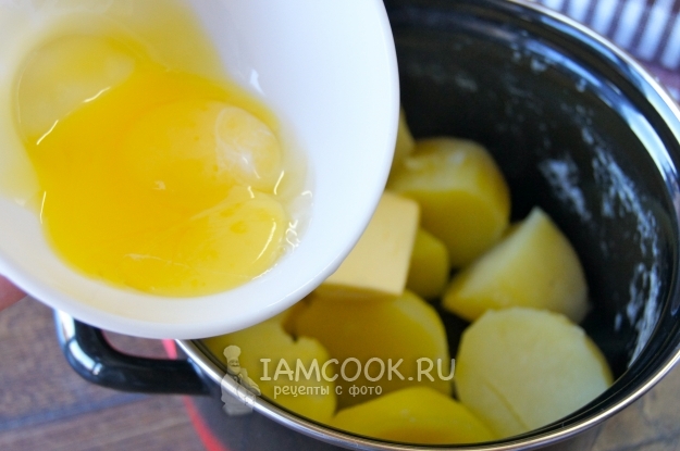 Яйца вымоем, отделим желтки от белков, желтки выльем в картофель.