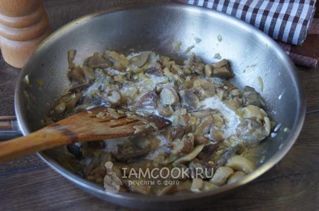 В углубление выложим грибную начинку. Поставим в разогретую до 200 градусов духовку до румяности.