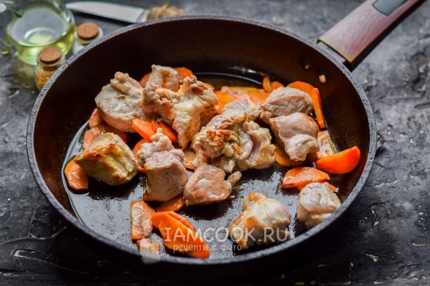 Прогреть хорошо большую сковороду, влить растительное масло. Выложить в сковороду морковь и мясо, поджарить 3-4 минуты, периодически помешивать.