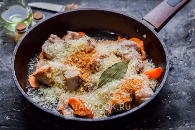 Добавить следом соль, молотый перец, специальные специи для плова, по желанию положить лавровый лист.