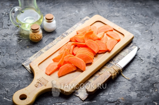 Почистить крупную морковь, сполоснуть и просушить. После морковь нарезать небольшими кусочками или кубиками.