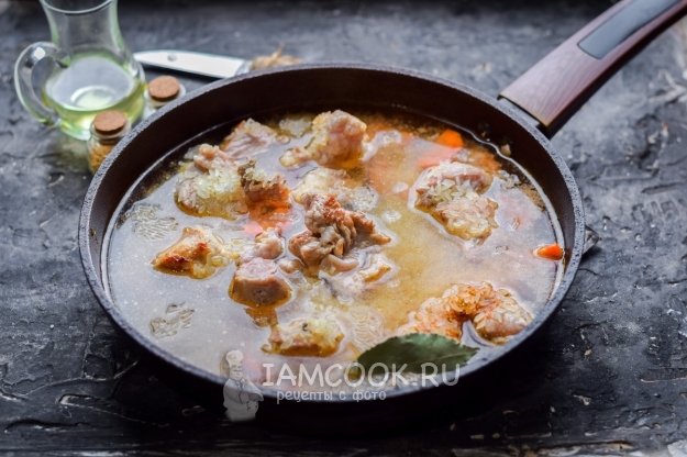 Влить в сковороду теплую воду, после необходимо поставить сковороду на небольшой огонь, прикрыть крышкой и готовить плов 25 минут. Спустя время разложить плов без лука по тарелкам и подавать к столу.