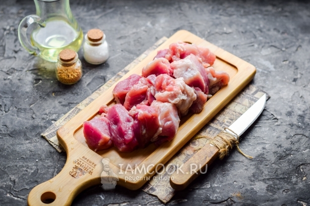 Свинину ополоснуть и просушить кухонными бумажными полотенцами. Свинину можно взять с прослойками жира. Нарезать мясо средними кусками.