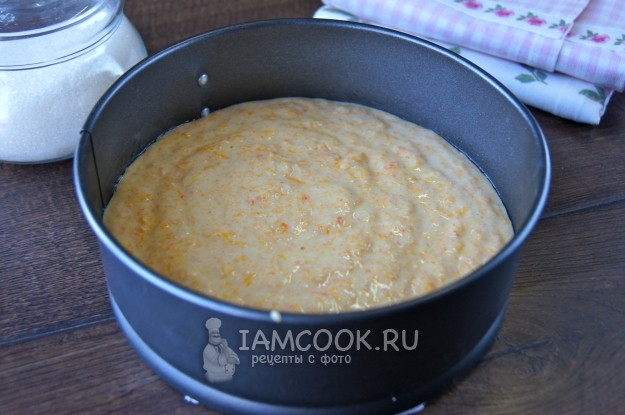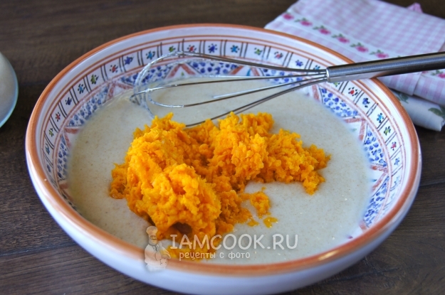 Затем натрите тыкву на мелкой терке и выложите в тесто.