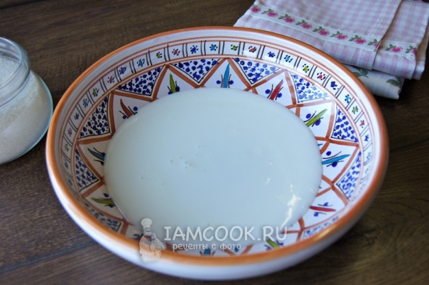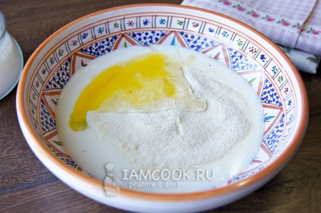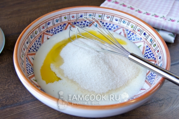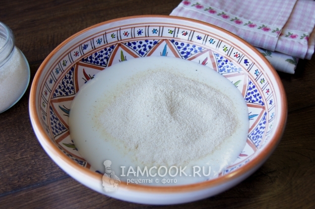 Добавьте сахар, перемешайте и оставьте минут на 10, чтобы манка немного набухла.