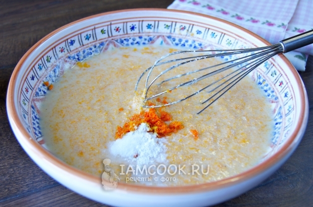 Далее добавьте цедру одного мандарина, разрыхлитель и ванилин, тщательно перемешайте.